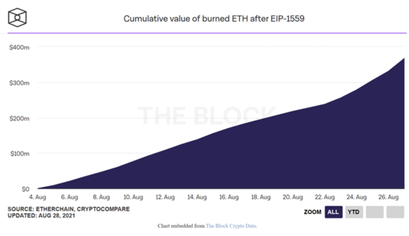 "EIP-1559, also known as the London Fork, was released 8/5/21 to make Ethereum transactions more efficient. The upgrade changed the incentive structure for miners, and put simply, improved the user experience when it came to paying gas fees. The upgrade has made gas fees more predictable and transparent for user transactions. Furthermore, the upgrade added deflationary pressure on ETH supply by burning a portion of gas fees. As of 8/30/21, 142,800 ETH have been burned representing $459mm in value and reducing the net issuance rate to 4.1%. EIP-1559 does not make ETH deflationary, but a step towards curbing monetary supply until ETH 2.0 launches - long-run we expect these changes to create an upward price pressure on ETH as supply decreases with increased network utilization.